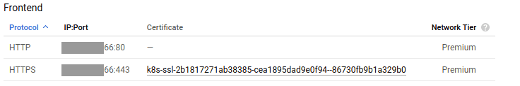 Currently, your ingress is only handling HTTP traffic. To handle HTTPS, you need to add a certificate to the load-balancer. Click your load-balancer, it’ll be named k8s-um-default-xxx. In the details of the load-balancer, hit the EDIT button (in the top bar).