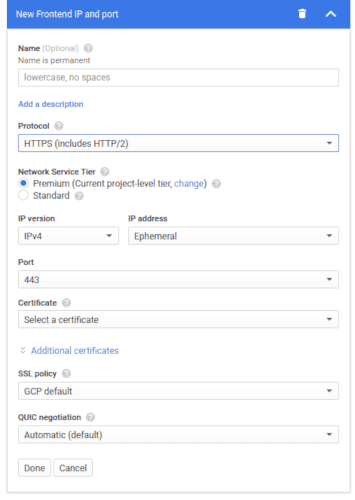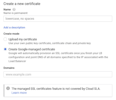 Click the Certificate dropdown and select Create a new Certificate. In the new modal, check Create Google-managed certificate.